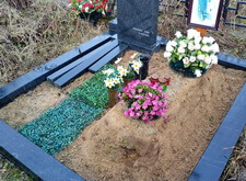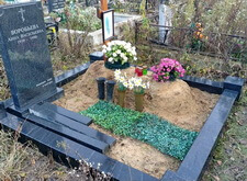 На данном участке был проведён сравнительно большой объём работ. Первым делом были убраны сорные растения и сухостой, заполонившие место захоронения. После этого мы помыли и протёрли весь гранит. Далее установили по центру участка вазы, наполнили их водой и поместили внутрь свежие цветы. Для удобства оценки качества проведённой работы мы сфотографировали убранное место захоронения с разных ракурсов.