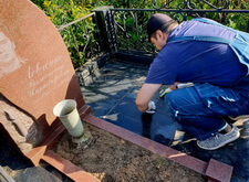 Приехав на кладбище, первым делом мы удалили кустарник, закрывающий памятник. Затем тщательно подмели цветник и территорию участка, после чего вытерли надгробье.